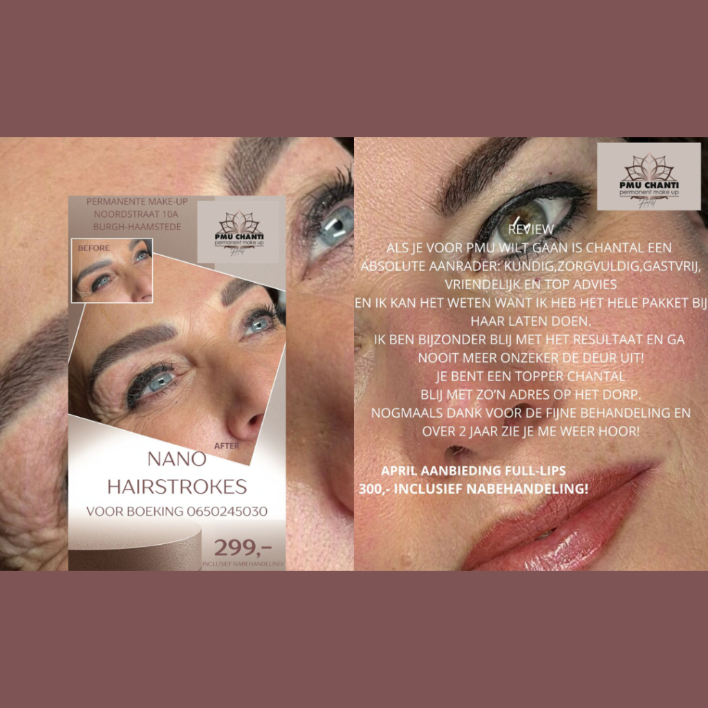 Wat een top zaak! Je wordt helemaal zen als je binnenstapt. Chantal doet er alles aan om het je zo comfortabel mogelijk te maken. En wat ben ik blij met het resultaat! Eindelijk door het leven met een paar mooie volle wenkbrauwen en lippen die er altijd verzorgd uitzien, ook als ik mijn lipgloss vergeet. Door de infra lash nu ook een openere en frissere uitstraling van mijn ogen! Nogmaals top! Bij Chantal moet je zijn, bij PMU Chanti ❤️